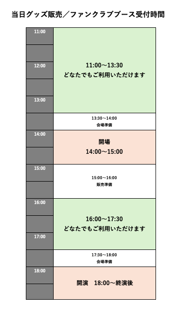 ※グッズ販売・ファンクラブブースでの継続お手続きに関して、開場直前〜開演前のお時間帯は混雑が予想されますので、ご利用のお客様は早めのお時間にお越しいただきますようご協力をお願いいたします。