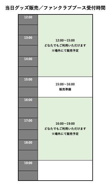 ※会場販売/ファンクラブブースの時間は、当日の状況により予告なく変更となる場合がございます。